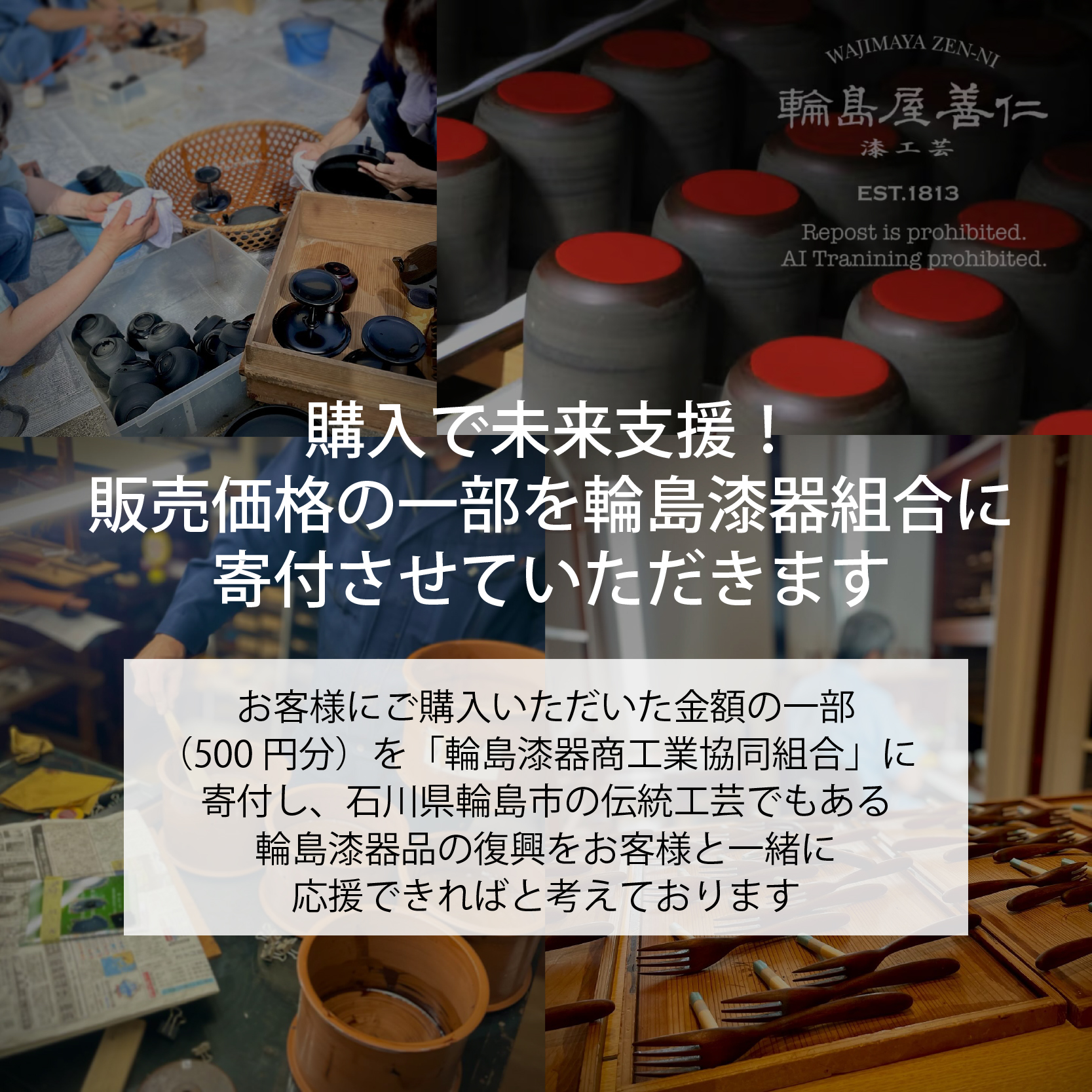 ご購入いただいた一部(500円分)を「輪島漆器商工業協同組合」に寄付し、石川県輪島市の伝統工芸でもある輪島漆器品の復興をお客様と一緒に応援。